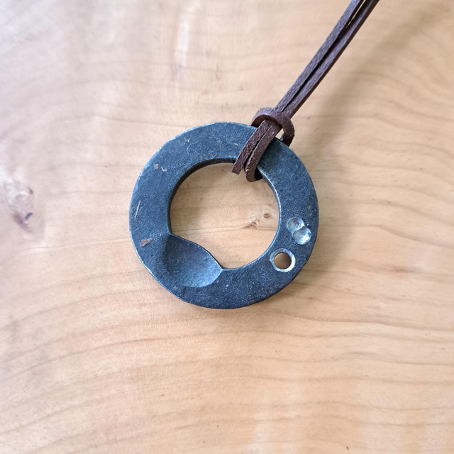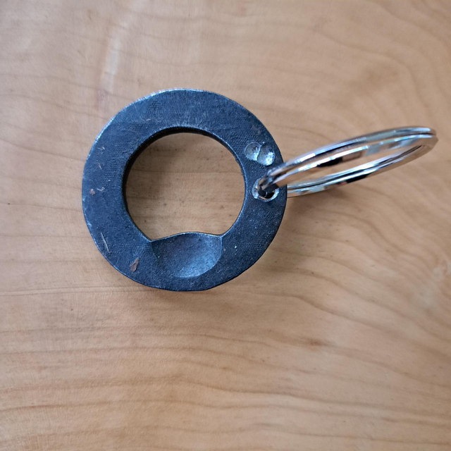 A bottle opener made from a big steel washer (45mm diameter ). Forged and quenched in vegetable oil and sealed with bee's wax. Can be put on a key ring or thong....(not included).